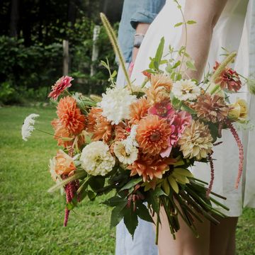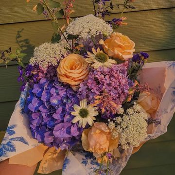A wrapped bouquet of seasonal flowers. Perfect for a hostess gift or taking to a date!